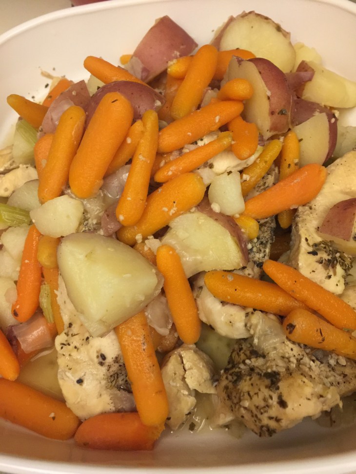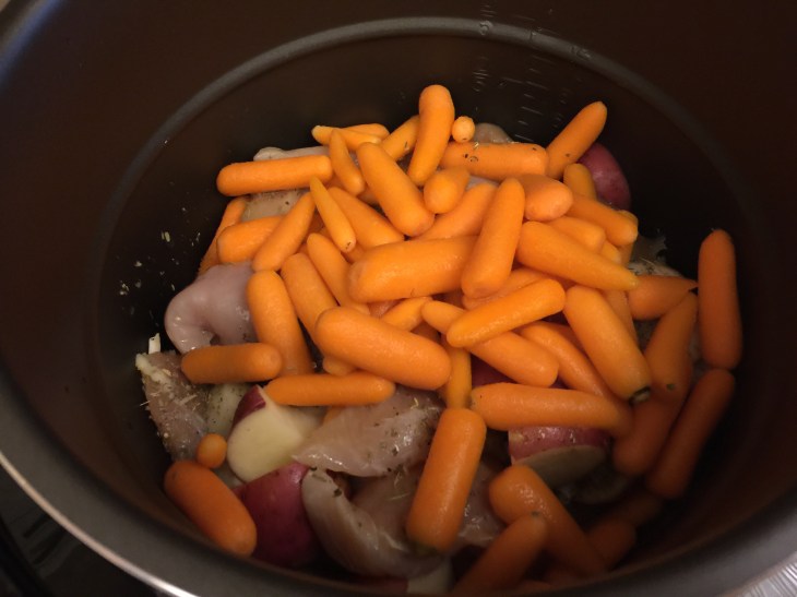 4 stakes of celery, Half of a yellow onion, 4 red potatoes, clove of garlic, a generous portion of carrots, 1 1/2 pounds of chicken tenders and a cup of chicken broth. Threw in some Italian seasoning, rosemary salt, little garlic salt and ground pepper. Just enough rosemary slot and pepper to cover the tenders.